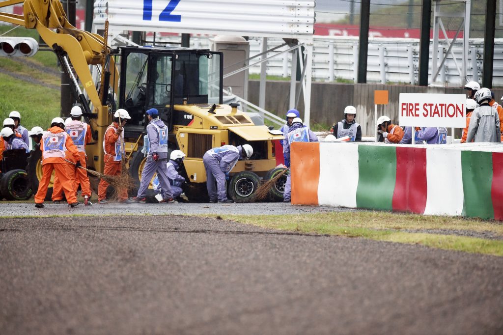 Das Wetter in Japan war schlecht, miserabel sogar. Mehrere Piloten hatten Probleme mit den widrigen Bedingungen. Adrian Sutil flog zum Beispiel in Runde 42 in der Dunlop-Linkskurve ab und fand sich im Kiesbett wieder.